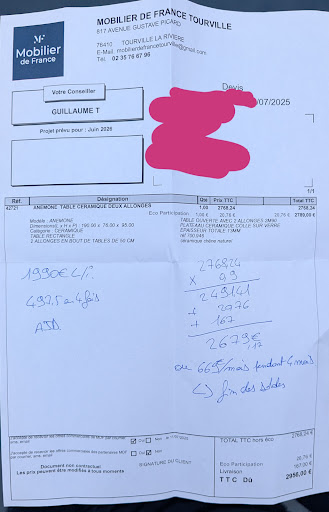 Read moreATTITUDE INACCEPTABLE de la part de l'enseigne mobilier de France. Suite à une importante commande de mobilier, nous quittons le magasin très contents en attente de notre futur livraison. Trois mois se passent et sommes avertis par le transporteur que cette dernière est arrivée complète au dépôt et prenons donc rendez-vous pour la livraison. Le jour de la livraison, un des livreur nous annonce et ce, pratiquement à la fin du déchargement que mes fauteuils et chaises de salle ne seront pas livrés ce jour sans explication claire. Aucune personne ne nous a prévenu !! ni le transporteur ni le magasin de Tourville-la-Rivière. Pour faire court, suite à quelques échanges téléphoniques, j'apprends avec stupéfaction que Mobilier de France est venu tout simplement au dépôt du transporteur pour se servir dans ma commande. Ils ont donc récupéré sans scrupule, mes chaises et mes fauteuils pour alimenter la commande d'un autre client. Comment Mobilier de France, enseigne haut de gamme et qui prône la satisfaction du client avec le slogan : "votre satisfaction est notre plus belle récompense" peut-il agir de la sorte ? Ce tour de passe-passe est ni plus ni moins du vol car cette marchandise est à mon nom et donc m'appartient de plein droit. Suite à cet événement, j'ai bien sûr réagi et Mobilier de France m'a proposé un dédommagement bien loin du désagrément et bien loin de leur comportement plus que malhonnête. Ils m'ont aussi proposé 6 chaises en dépannage qui devaient m'être livrées très rapidement mais que j'attends encore ! ( aucune manifestation de leur part depuis ). J'espère que ce message sera productif, et lu par un grand nombre de personnes y compris certains dirigeants de l'enseigne et ce, pour mettre au grand jour que certaines personnes au sein de Mobilier de France n'ont aucune scrupule à réaliser de tels tours de passe-passe au mépris du client, quel dommage ! PS : j'attends vos réactions avec impatience et surtout des...