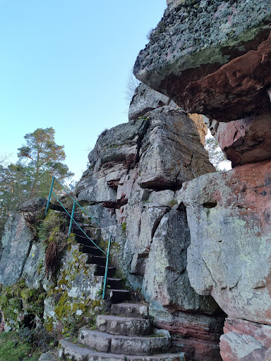 Une bonne montée dans les pins. On grimpe mais c'est assez régulier dans les senteurs de résine et la seule difficulté est les 100 derniers mètres qui montent plus durement dans les racines et rochers. Ensuite on découvre trois rochers énormes sur lequel on peut grimper avec les marchés creusées dans le grès rouge et même si cela peut paraître impressionnant les rembardes sont bien solides et stables. La vue sur la ville de Saint Dié en bas et les Vosges...