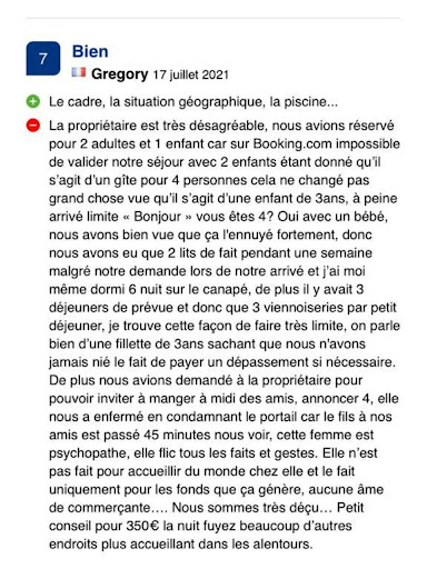 Read moreUne propriétaire qui n’affronte pas ces clients de face mais qui s’adonne à la calomnie par message privé plus de trois semaines après notre départ . Sous prétexte que nous n’avons pas apprécié notre seconde expérience dans ce gite en mettant un avis mitigé via leboncoin (avec des étoiles , sans aucun détail à la base) . Plusieurs coupures de courant et d’eau chaude , communication très désagréable , piscine à une température limite (aucune marge de manœuvre possible elle a réponse à tout) et j’en passe et des meilleurs . Si vous rencontrez la moindre difficulté gare à vous , Manque de professionnalisme . Une copie sera transmise au site qui répertorie ses annonces avec les preuves dont...