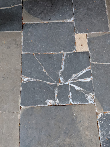 I've included photos showing the monument, one showing a hole in the roof where a mortar shell fell, and another photo of a cracked floor stone. The story as it was relayed to us, is that this is where the mortar shell hit, but failed to detonate.