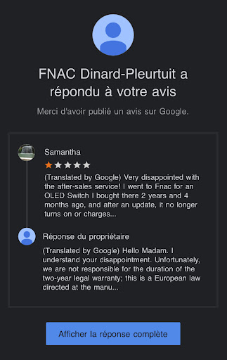 En effet, je suis allĂ© voir la Fnac pour une Switch OLED que jâavais achetĂ©e lĂ -bas il y a 2 ans et 4 mois et qui, suite Ă une mise Ă jour, ne sâallume plus et ne charge plus. Le vendeur me dit explicitement : « Votre garantie est dĂ©passĂ©e de 4 mois, nous ne pouvons rien faire », et va mĂȘme jusquâĂ me faire comprendre que câest de ma faute et que jâaurais dĂ» plus lâutiliser.