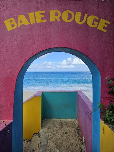 There are two entrances on either side of the parking area. If you're looking for a bit of local art, take the entrance on the right; it features a beautifully painted stairway marked with the 'Baie Rouge' sign – a perfect photo opportunity!