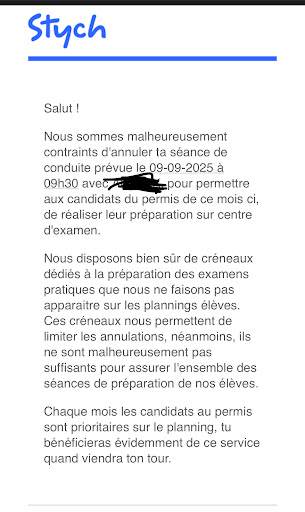PS : on m’a indiqué que Stych contacte les personnes qui mettent des avis négatifs. Ils proposent des dates de permis si vous retirez l’avis. Pour ceux qui galèrent à en avoir une, essayez. Personnellement j’ai obtenu mon permis donc à moins de contacter pour un éventuel dédommagement, mon...