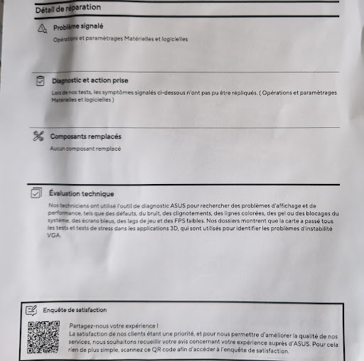 J’ai déposé mon PC pour des problèmes de crashs et freeze. 3 jours plus tard, un monsieur m’appelle pour me dire qu’il n’a rien détecté, ET JE DEMANDE à ce qu’il le garde encore quelques jours pour m’assurer qu’il n’y ait vraiment rien. Je passe le récupérer et je reçois un monsieur qui me dit qu’il n’y avait rien d’anormal. Ils ont cependant tout mis à jour et installé des logiciels pour surveiller en cas de nouveaux crashs, mais avec leur « diagnostic très poussé » rien d’anormal et PAS DE DOMMAGES MATÉRIELS À DÉPLORER. J’ai cependant une garantie de 2 semaines en cas de bug. Deux jours plus tard d’utilisation, j’ai un crash mais différent de d’habitude alors je le ramène. L’ORDINATEUR MARCHE ENCORE. On me dit alors qu’il le garde 7 jours (jusque-là pas de souci). On m’appelle plusieurs jours après pour me dire qu’ils ont refait leur diagnostic très poussé et qu’effectivement il y a un problème : l’alim ne tient pas assez, alors elle a cramé la carte mère lors d’un test et par conséquent 230 € de devis pour changer ces deux composants… J’arrive en boutique pour demander plus de renseignements et puis un monsieur me dit « vous avez l’air étonnée ». … Bien sûr que oui, car je vous ai demandé dès le premier diagnostic s’il fallait changer l’alim et on me dit « non, ça doit pas être ça, le PC n’a que 2 ans », et puis là j’ai deux composants...