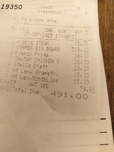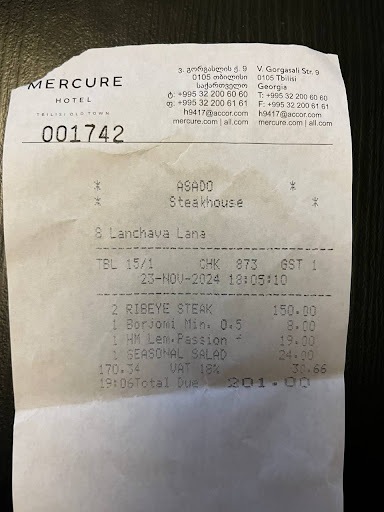 Both steaks were seared on the sides by direct fire. This dried out the edges of the meat. Maybe someone likes this, but I do not. Despite this, the ribeye was quite tasty, but unreasonably expensive, considering that the meat is locally produced: 25 euros + some additional 18%, which were added to each item in the final bill (total 30 euros). The bill says that this is VAT, but this is not true. According to Georgian law, all prices must be indicated in full on the menu: 12 Feb 2024 The Competition and Consumer Agency has established a standard for indicating the total price in the food service sector.