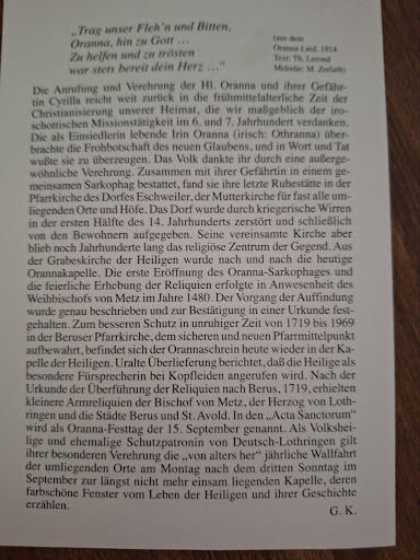 Die Orannakapelle der Gemeinde Überherrn ist der heiligen Oranna gewidmet ,die im Saarland sehr verehrt wird.Sie ist eine Schutzpatronin bei Ohr,- und Kopfleiden wird sie aufgesucht und zu ihr gebetet. Die hl.Oranna soll Kranke mit Kopf und Ohrleiden gepflegt haben. Ihre Statur befindet sich im Innern der Oranna-Kapelle mit der Besonderheit ;sie hält ein abgeschnittenes Ohr ,welches sie in ihrer linken Hand trägt. Die Kapelle wird liebevoll gepflegt und im Innenraum brennen viele Kerzen und Sitzgelegenheiten...