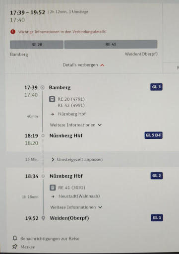 Read moreIch fahre heute um 7:29 ab Westbahnhof von Aachen über Rheydt und über Koblenz und über Frankfurt am Main und über Bamberg und über Bayreuth nach Weiden/OPf zurück und habe schon Problem bei Fahrt von Frankfurt am Main nach Bamberg und habe im Zug warten müssen und weitere Fahrten?