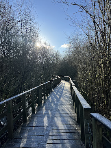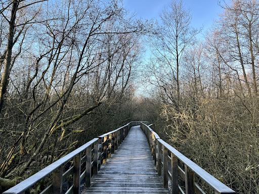 Sehr schöne und mystische Gegend, besonders kurz vor Sonnenuntergang. Interessante Infotafeln informieren über die Gegend und Zeitgeschichte. Zum Wandern perfekter Ausgangspunkt - allerdings vielleicht nichts für Leute, die ängstlich sind, wenn der Untergrund „wacklig“ ist, da die Brücke sich beim Gehen mitbewegt. Werden nochmal im Frühling/Sommer wiederkommen und sind gespannt, wie das Moor...