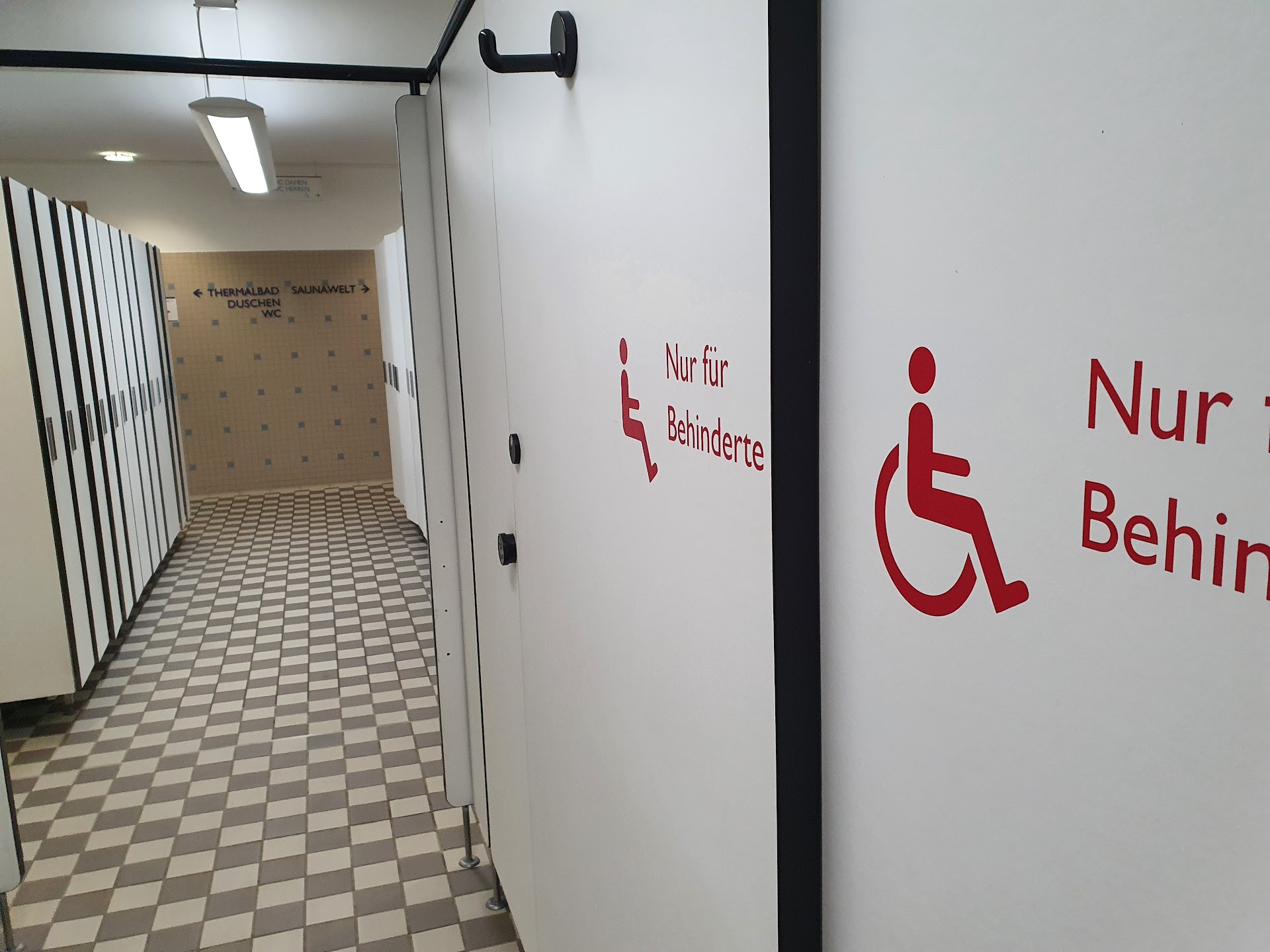 Es gibt einen Fahrstuhl vom Kassenbereich zu den Umkleiden im Bad. Die erste Umkleide ist für einen Rollstuhlfahrer mit Begleitperson nicht zu nutzen - viel zu klein. Wenn man etwas weiter geht, gibt es eine, die mit dem Euro-Schlüssel geöffnet werden kann und im Durchgang zum Bad gibt es noch eine Umkleide mit angeschlossener Dusche und WC für Rollstuhlfahrer. Der Raum mit Dusche/WC hat auch schon bessere Zeiten gesehen. Die elektrischen Einrichtungen zum Schliessen der Türe sind ohne Funktion. Ein Papierschild weist darauf hin, dass die Türe von Hand zu Schliessen/Öffnen ist.