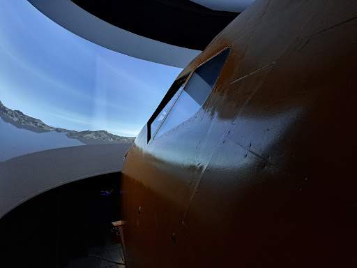 Tatsächlich ist das Cockpit unbeweglich. Es hat sich aber schnell gezeigt, dass dies der Immersion keinen Abbruch tut, denn die 180 Grad Projektion auf einer Leinwand rund um die Frontscheiben lässt das Fluggefühl sehr real wirken.