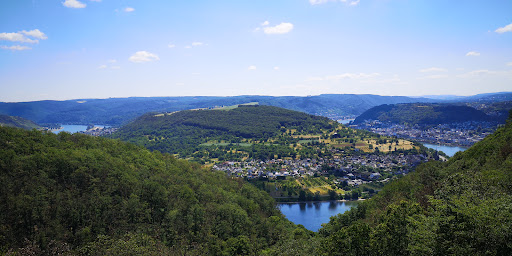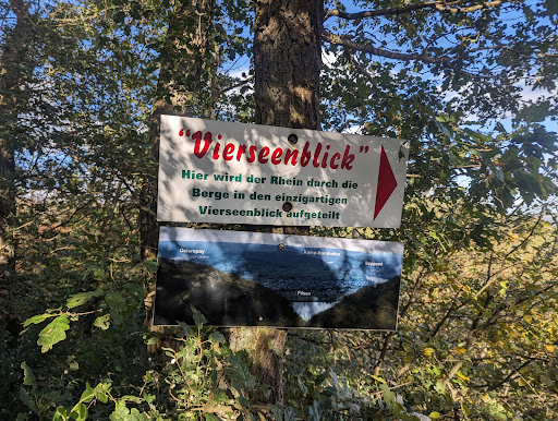 Hier ist eine kleine beschilderte Stelle, die einen virtuellen Blick auf den Rhein zulässt. Aufgrund der geografischen Lage inklusive des Blickwinkel erscheint der Rhein aufgeteilt in 4 Seen.