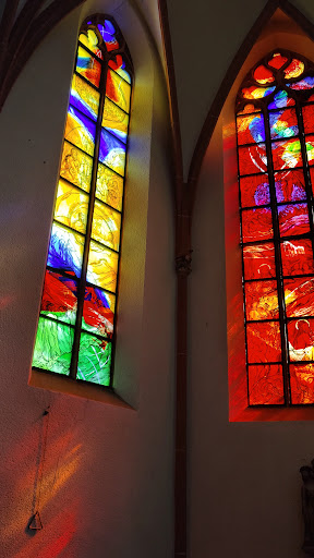 Erst in den Jahren 1959 - 1963 entstand der heute zusehende Kirchen Neubau. Der sogenannte " Alte Chor " ist im Kirchen Neubau noch ein Überbleibsel aus dem 15 Jahrhundert, der mit ein paar anderen Altertümer in diese Kirche integriert werden konnte. Die Schlichtheit wie sich diese Kirche von innen wie außen präsentiert, gefällt mir sehr gut. Zum Gebet schließt man eh die Augen...Der eigentliche Kirchenschmuck sind für mich die schönen Kirchenfenster, die ich, so, noch nie in dieser Vielfalt, in einer anderen Kirche zu sehen bekommen habe. Beim Betrachten der Kirchenfenster, ist es anders als beim Gebet. Hier braucht man offene Augen, denn es gibt vielfältiges an allen Kirchenfenstern dieser...