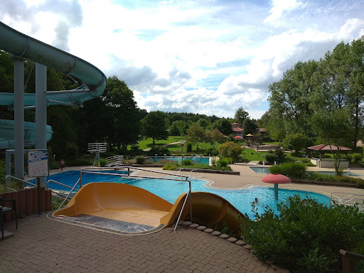 Hier gibt es alles was Spaß macht, aber auch Erholung verspricht. Das große Becken -wie alle anderen sauber und ordentlich gefließt- verfügt über 2 Rutschen. Davon ist die eine eine Speedrutsche die andere schlängelt sich aus größerer Höhe über 5 Kehren bis ins Wasser. Daneben gibt es ein 4m tiefes Becken für das 1m Sprungbrett und den 3m Sprungturm. Aber auch an die Kleinsten ist mit einem Kinderbecken gedacht. Für die Erwachsenen gibt es dazu noch ein separates ca. 2m tiefes Schwimmerbecken. Der gesamte Wasserbereich ist liebevoll mit allerlei Grün umpflanzt, ein aufmerksamer Schwimmmeister hat stets die Gäste im Blick. Daran grenzt eine gepflegte Anlage mit großen Rasenflächen. Hier sorgen nicht nur Bäume für angenehmen Schatten. Beim Imbiss, der mit einer schönen Terrasse zum Verweilen einlädt, gibt es Sonnenschirme zu fairen Preisen zur Ausleihe. Verschiedenste Speisen, Snacks und Getränke und natürlich Eis können hier ebenso preiswert erworben werden. Von hier oberhalb hat man einen schönen Blick über das gesamte Freibad, was in einer idyllischen Senke liegt. Dem gegenüber lockt der Beachvolleyball- Platz zum ausgelassene Spiel. Für Kinder gibt es zudem einen großen Spielplatz mit 2 Kletterburgen. Auf diesem Spielplatz können die Kinder auch herrlich in Sichtweite der Eltern spielen. Durch die gut durchdachte Gestaltung der verschiedenen Zonen kann hier ob groß ob klein, Ruhe und Erholung genauso finden, wie Spaß und Action ohne sich gegenseitig zu beinträchtigen. Auch die sanitären Anlagen machen einen sauberen Eindruck. Insgesamt ein sehr...