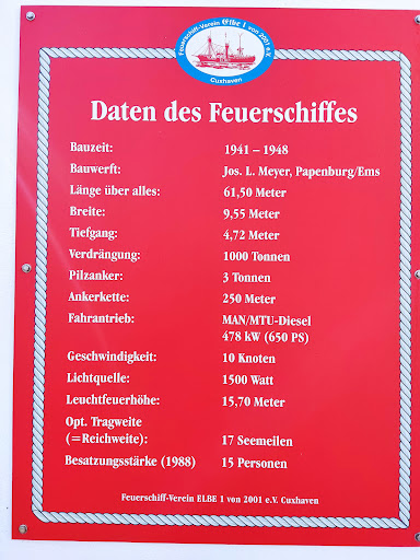Read more1948 fertig gestelltes historisches Feuerschiff, dass 1988 außer Dienst gestellt wurde. Ein interessantes maritimes und technisches Denkmal. Die Besichtigung ist sehr interessant und das Eintrittsgeld nicht hoch mit 5 Euro für einen Erwachsenen. Für Kinder und Familien gibt es Rabatt. Es werden auch Führungen angeboten. Das Schiff kann nur dank der ehrenamtlichen Arbeit vieler Mitglieder des Trägervereins erhalten werden. Ein Besuch lohnt sich, aber auch nur von Ferne ist das Schiff eine Bereicherung für den Hafen und ein tolles Fotomotiv. Gelegentlich unternimmt der Trägerverein auch bis zu mehreren Tagen dauernde Fahrten mit dem Schiff. Es gibt eine Internetseite des Trägervereins (einfach Feuerschiff Elbe 1 googeln) mit umfangreichen Informationen zum Schiff, dem Verein, Fahrten und...