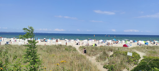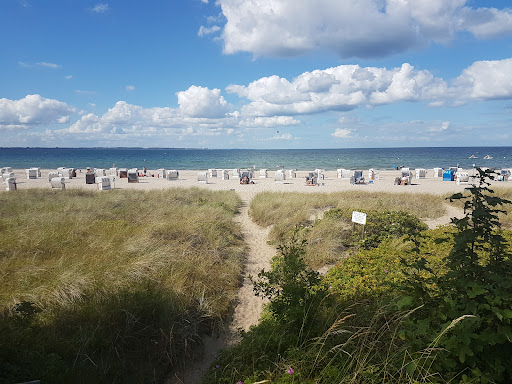 Исходя из небольшого опыта, могу сказать, что это обычный пляж в Германии. К особенностям могу отнести: пункт спасателей на воде(которые добросовестно мониторят прибрежные воды и при необходимости аккуратно корректируют необузданных пляжников, к счастью их немного) с информационным стендом о температуре воды, воздуха и ещё чего-то, также имеется информация о состоянии моря в виде сигнальных флажков. Имеются спасательные средства. К услугам желающих есть кафе и бистро, магазин пляжных аксессуаров, дайвинг клуб и бесплатный туалет. Также есть открытый душ и душ для ног. Кроме этого есть прокат велосипедов и платные парковки, кемпинг. К моему сожалению, в культуре коренного населения есть стремление к открытости, что проявилось в полном отсутствии кабин для смены купальных костюмов и окон без занавесок и штор в жилых домах. На данное неудобство часть населения совершенно не обращает внимания и неспеша переодевается при несовершеннолетних. Другая часть пляжников решает проблему путем использования накидок для серфинга по цене 40€ или других подручных средств(полотенец). Пляж песчаный, но с неприятной прослойкой мелкой гальки, которая делает вход и выход из моря болезненным. Проблема решается путем приобретения пляжных резиновых туфель по цене от 6€ или пройти дальше от официального пляжа и найти место входа без гальки. Расположиться на пляже можно захватив с собой коврик для фитнеса или нечто подобное. Коврики для фитнеса магазинах спорттоваров дорогие (от 50€), поэтому лучше приобрести их по цене 9,99€ в ALDI. Температура воды в море колеблется около 17-18 °С, а воздуха около 20-24°С. На пляже много серферов и любителей яхтинга. Пляжный песок преимущественно чистый (имеется в виду антропогенный мусор, мусор природного происхождения присутствует) имеется достаточное количество мусорных баков при...