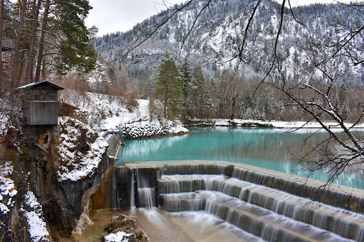 At the Lechfall in Füssen, the mountain river shows its wild origin one last time before it is finally tamed by the dam walls of the Forggen lake. Here in Füssen, the Lech forces its way through a narrow gorge before it leaves the Alps. At this point, the river was dammed by an artificial weir at the end of the 18th century for the use of water power. The weir replaced the natural cataract and today forms the Lechfall. The water masses of the Lechfall at Füssen plunge over five steps 12 meters into the deep Lech gorge. Unlike the weir, the Lech Gorge near Füssen is of natural origin. At the end of the last ice age, the glacier lake, which covered the entire Pfronten valley floor, flowed into the foothills of the Alps at this point. Over the millennia, the water dug today's gorge into the rock.