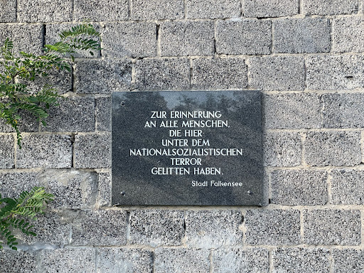 Wie die Stadt Falkensee auf dem GelĂ€nde in einer Marmorplatte eingelassen hat, dient dieser Platz nun: âZur Erinnerung an alle Menschen, die hier unter dem nationalsozialistischen Terror gelitten haben.â