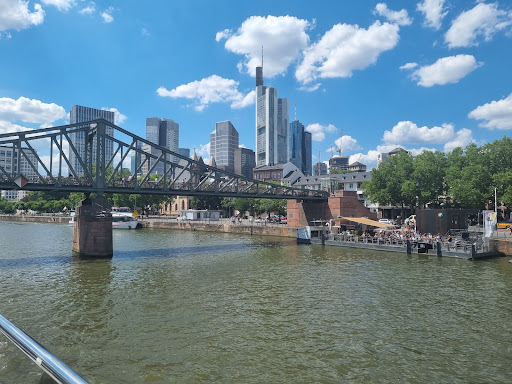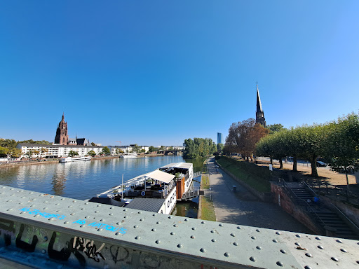 The connecting line of the port railway runs along the Mainkai , which is also used for special passenger trains of the Frankfurt Historical Railway . The Mainkai is the main landing stage for the Frankfurt passenger shipping company and a departure point for the Cologne-Düsseldorf Rhine shipping company . [ 2 ] Excellent photo ops of Frankfurt when crossing the 2 bridges Handicap doable but challenging. Restrooms limited. Restaurants abound , especially interesting are the restaurant boathouses !!!!!!!!!!! Final take Recommended highly for a bit of...