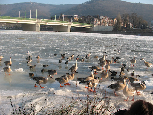 Its like a visual treat in winter....while passing through Heidelberg river Neckar gives breathtaking views near old bridge..Castle...frozen layer of river..groups of birds playing with the snow & enjoying the phase whatever nature brings to them..truly these avian species always have life...