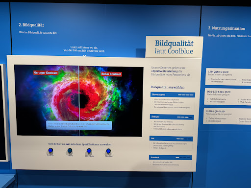 Der Laden ist optisch wirklich schön, modern, hell und gar interaktiv. Gerade die Fernsehabteilung um wirklich die Unterschiede und verschiedenen Panel Typen zu unterscheiden mit den jeweiligen Empfehlungen.