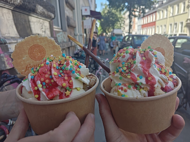 Und ein letzter Punkt muss leider weichen, dafür dass normale Waffeln kein Geld kosten, vegane Waffeln aber schon. Ja, klar, werden die im Einkaufspreis teurer sein, aber somit gehört man eben zu der verhassten Industrie, die den Preis anhebt, nur weil man "vegan" drauf schreibt. Das finde ich echt schade. Wenn man sich einfach nur vegan ernähren möchte wird man jetzt auch schon von Eisdielen zu Sonderzahlungen genötigt. Andere Eisdielen schaffen das auch ohne 0,20€ Extra Waffel-Geld.