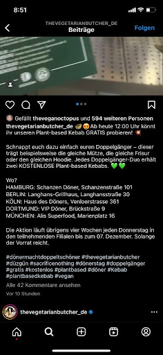 Haben bei Instagram dieses tolle Gewinnspiel für veganen Döner von vegetarian butcher gesehen. Sind dann gestern (Donnerstag) extra von Bremen gut vorbereitet im Partnerlook hergekommen. Vor Ort war eine längere Schlange. Die Leute vor Ort waren auch wegen dem Gewinnspiel hergekommen. Wir versicherten uns, dass vom Spieß noch etwas da ist. „Solange der Vorrat reicht“. Hieß es im Gewinnspiel. Irgendwann meinte der Verkäufer: „Nur bis 18 Uhr“ Unter den Leuten kam Frust auf, weil das nirgendwo geschrieben stand. Manche kauften sich trotzdem einen der Döner, da die meisten hungrig herkamen. Wir haben dort nichts mehr gekauft und werde ich in Zukunft auch nicht.