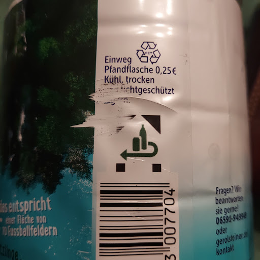 Am Pfandautomaten wurde eine Flasche wegen leichter Beschäftigung des Pfandzeichens (s.u.) nicht angenommen. (Abnahmeverpflichtung)
