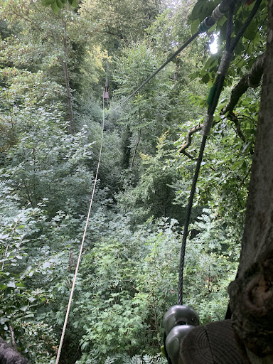 Sehr idyllisch! Mitten im Wald kann man sich wie Tarzan umherschwingen. War unser 1. Mal überhaupt. Wichtig zu wissen wäre: Ja! Man kann zwischendurch aufs Wc gehen. Das Geschirr muss dann ausgezogen werden. Aber Zeit habt ihr wirklich genug. Wasser unbedingt mitnehmen! Bei so viel Anstrengung kommt man scho ins schwitzen. Und wer mag schon Kopfschmerzen bekommen, wenn man grad den dreh raus hat. Essen nicht vergessen. Ein kleiner Stand wo es Eis gibt, ist vorhanden. Was die noch haben weiss ich leider nicht. Man wird in einer Gruppe eingewiesen wie man sich in das Geschirr reinfindet. Danach wie der schließ Mechanismus funktioniert (mit praktischer Übung ). Dann kanns auch schon los gehen. Ps. Wer Rucksack ect. Hat kann das öffentlich sichtlich hinhängen. Wertsachen in kleinerer Größenordnung werden eingesperrt, falls ihr das wollt. Bei langen Haaren einen Gummi mitbringen. Die müssen zusammen gebunden werden. Da unsere Gruppe aus zwei Mädels und 2 Jungs bestand haben wir uns direkt getrennt. Logo welcher " Mann " will scho mit dem leichten Kurs anfangen. Wer noch nie da war und keine Ahnung hat wie viel Kraft man wirklich hat, sollte wirklich klein anfangen!!! Mir selbst hat der flying fox am besten gefallen. Auf jeden Fall mitnehmen auf eurer Tour! Leider hab ich nach einiger Zeit keine Kraft mehr gehabt und dazu kam das meine linke Hand taub wurde. Also durfte ich mich "retten" lassen. Einfach einen herumstehenden bitten kurz oben in der Hütte Bescheid zu geben das nix mehr geht. Dann kommt in ca. 5 bis 8 min. Jemand. Das Gelände ist gross und die Ausrüstung muss ja auch angelegt werden. Einfach kurz Geduld haben. Kann ja an sich nix passieren. Alles sehr professionell abgelaufen. Ohne komische Gefühle dabei das man jetzt was falsch gemacht hätte. Danach ausruhen auf den vielen Sitzgelegenheiten und die Gegend geniessen. Tolles Personal. Tolles Ambiente. Die Preise sind voll in Ordnung! Sehr zu...