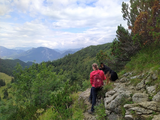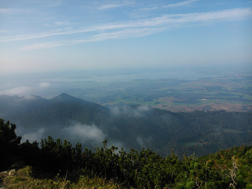On one side a beautiful view of the Alps and on the other side a view of the Chiemsee, with the Wagingersee visible in the background. Easy walk from this parking lot (free): 47.7514182N, 12.6291168E along Wanderweg 66 Hochfelln, past the river and the waterfall. The elevation gain is 1000 metres, total route length 7 kilometres, about 3 hours. We walked completely alone for the whole walk, there was no one else around. Watch out for the signposted Maximiliansweg (Beyern), it is in the part after this signpost 47.7574844N, 12.5864965E towards Rupholding is very dangerous. It leads up a steep cliff, the path is cut into the rock, only 20 centimetres wide. There is nothing to hold on to, the abyss below the path is extremely deep. A very, very dangerous place. Completely impassable for dogs. I recommend avoiding it and taking the nicer Wanderweg 66 Hochfelln. It is longer but easy and offers beautiful views of the...