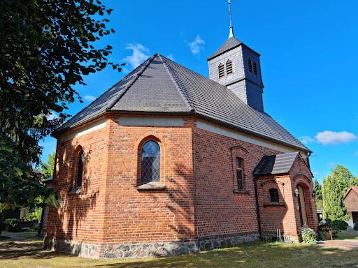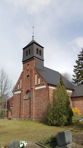 Der rote Backsteinbau wurde 1867 geweiht.1902 erfolgte ein grundlegender Umbau, der von Kaiserin Auguste Viktoria begrüßt wurde, wie eine Bibel mit ihrer handschriftlichen Widmung dokumentiert. Das neugotische Gotteshaus wurde auf den Fundamenten eines erstmals 1346 erwähnten Fachwerkvorgängerbaues errichtet, in dem sich die Grabstellen des alteingessenen Junkergeschlechts der Löschebrands befanden. Die Gruft wurde zugeschüttet und ist nicht mehr begehbar. 1881 besuchte Theodor Fontane Dorf und Kirche. Gestühl, Dach und Elektrik wurden in den Jahren 1999 bis 2000 instand gesetzt. 2001 wurde die Kirche wieder eingeweiht. 2009 erfolgte die Sicherung und Reinigung des Altars mit Spendenmitteln. Seine farbliche Restauration wurde am 29. September 2013 abgeschlossen. Auf dem Kirchenfriedhof befinden sich die Gräber der UFA-Schauspieler Käthe Dorsch, beigesetzt 1957, und Harry Liedtke, beigesetzt 1945, sowie eine bronzene Gedenktafel für die Gefallenen des Ersten und Zweiten...