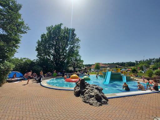 Insgesamt ist im Freibad wenig los, der Kleinkind ist aber doch recht gut besucht. Zur Ausstattung: Es gibt zwei Rutschen Einen Wasserfall mit Kunststeinen zum klettern und planschen Ein zweistockiges Rondell mit kleinem Springbrunnen Eine Schnecke mitten im becken zum klettern Ein seehund am Rand vom Becken der aus seiner Schnauze Wasser spritzt.