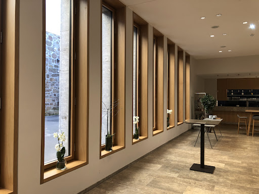 Während einer längeren Wartezeit hatten wir hier die Gelegenheit und manche Räume im Bereich der Rezeption, die Außenterasse und den alten Teil der ehemaligen Abtei anzuschauen und einige Fotos zu machen. Bei dem guten Wetter ging der Blick in Richtung Nordwesten bis zu den Kraftwerken westlich Köln und auf der anderen Seite bis zum Siebengebirge. Das Personal am Empfang war ausgesucht höflich und hilfsbereit- leider durfte der Hund...
