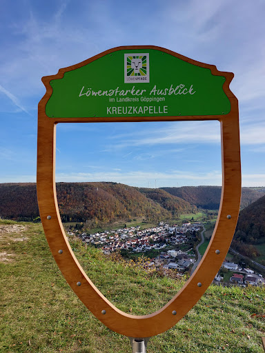 Sonnendurchflutet angelehnt an eine kleine Lichtung liegt die Kreuzkapelle Gosbach auf einem hohen Kamm mit einem sagenhaften Ausblick auf die Autobahn A8, den angrenzenden Drackensteiner Hang und das obere Filstal.