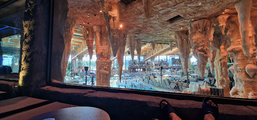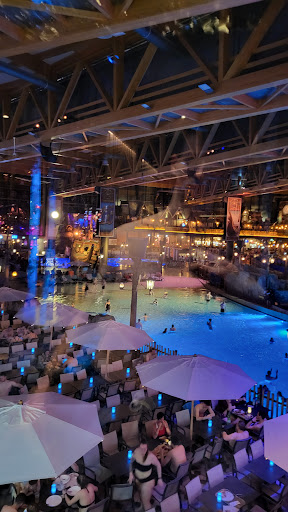 There are several lounge areas where you can purchase drinks and food (poke bowls and paninis), which are a great alternative to the fast food inside the park. There is also a free water dispenser (which the rest of the park lacks).