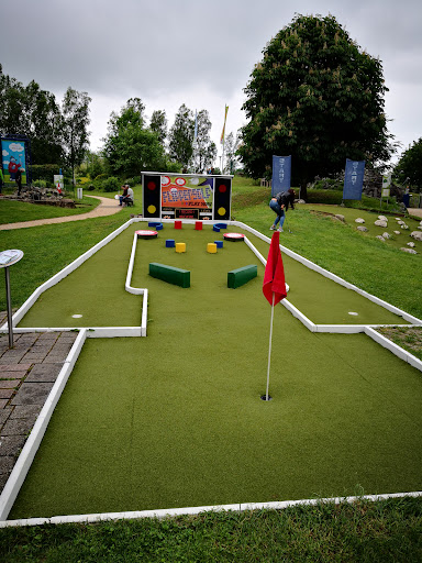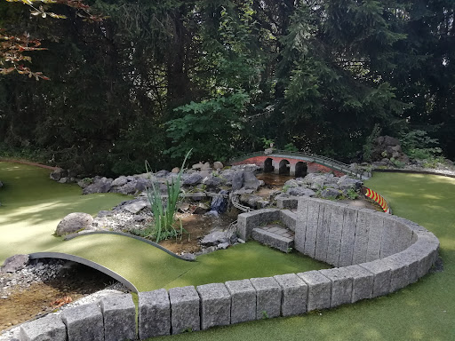Read moreAn sich eine super Idee, und insgesamt machen die Bahnen viel Spaß. Und jetzt kommt das aber: Auf der Anlage gibt es keine Toiletten. Ungünstig, wenn man dort in der Regel 2-3h verbringt. Die Bahnen sind an sich toll, aber grad die Bahn Säntis ist extrem Störungsanfällig. Bei uns fiel die Bahn mehrmals aus, weil sich der Ball in den Gondeln verkeilt hat, was dazu führt dass wir die Bahn überspringen mussten. Bei anderen Gästen ist das auch passiert. Der Eintrittspreis ist mit 12,50 pro Person doch recht happig, aber leider Inflationsbedingt zeitgemäß Und jetzt der größte Kritikpunkt, wofür der Bahnbetreiber nix kann, was aber den Spielspaß EXTREM nach unten schiessen lässt: Die Minigolfanlage ist gerade am Wochenende unbesuchbar, da der Andrang UNFASSBAR groß ist. Das führt dazu, dass man 8-10 köpfige Familien vor sich hat, pro Person kann man grob mit ~2 Minuten Spielzeit pro Bahn rechnen (und das ist optimistisch), was pro Bahn locker zu Wartezeiten von 15-20 Minuten führt. Das ganze multipliziert mit 18 = 0 Spass. Dazu kommt, dass dann die Leute denken sie sind besonders schlau und überspringen Bahnen mit hoher Wartezeit, was alles noch viel schlimmer macht, weil ein chaotisches hin und hergerenne entsteht und man plötzlich 2 dieser 8 köpfigen Familien vor sich hat. Wir haben letztenendes Bahn 10 einfach weggelassen. Teilweise ist die Wartezeit auch den Bahnen geschuldet, da viele Bahnen einfach automatisierte Parts haben, bei denen man knapp 1 Minute zuschauen muss, wie der Ball irgendwelche Aufzüge hochgezogen wird, oder besonders schlimm Burg Meersburg wo der Ball gefühlt eine Minute durchrollt und manchmal sogar stehen bleibt, sodass man anschusen muss. Säntis natürlich, und die Ravensburger-Spieleland Bahn. Ernsthaft, macht den...