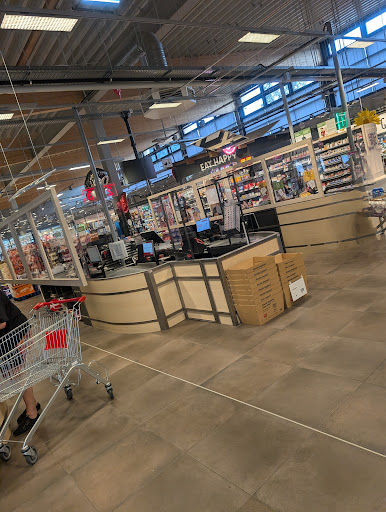 Read moreHeller großer rewe Markt, der zwar beim ersten Mal etwas merkwürdig angeordnet ist und man die ein oder andere Sache suchen muss. Trotzdem super hell und übersichtlich gestaltet mit Platz in den Gängen. Sicher nicht jeder gang optimal, besonders mit Einschränkungen aber machbar wenn man etwas Platz einfordert :)