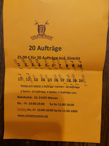 Read moreGrundsätzlich ist die Schattenmine eine tolle Idee. Nur kann es für mich nicht sein, dass ich entweder pro Kind pro Stunde 6 € zahlen soll oder für 20 Spiele 20 €... Denn natürlich braucht das eine Kind eine andere Zeit für ein Spiel, wie ein anderes... Da muss man sich schon entscheiden, wie man abrechnet... Wir fühlten uns am Ende rausgeschmissen, weil wir uns 2 Mal für die 20€ entschieden haben und dann darauf angesprochen worden, das das so nicht ginge... Unsere Kinder brauchten pro Spiel eben mehr Zeit... Außerdem wird auch nicht wirklich darauf geachtet, ob sich die "Bösen" an die Regeln halten... Dadurch konnten unsere Kinder den Auftrag nicht erfüllen, weil Sie von anderen immer wieder massiv daran gehindert worden... Das geht für mich.