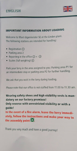 Read moreWjazd do firmy jest na skrzyżowaniu ulic Am Kruggarten z ulicą Wendessener Strasse. Ogólnie dojazd jest dobrze oznaczony od centrum miasta bo są znaki informacyjne gdzie należy jechać. Stajesz na bramie, idziesz do ochrony tam podajesz imię i nazwisko a ochroniarz wypełni kartę i z nią wjeżdżasz za bramą od razu w prawo później w lewo i do końca znowu w lewo. Stajesz na parkingu i między 10 a 11 rampą meldujesz się. Poda Ci numer rampy i jedziesz na wagę. Na wadze nie robisz nic tylko czekasz na zielone światło i po zważeniu pod rampe. Po załadunku magazynier przyniesie Ci papiery i znowu jedziesz na wagę ale do biura już nie wracasz tylko jedziesz bezpośrednio na wyjazd. Ochronie oddajesz tą samą kartkę i przepustkę i to wszystko. Ja akurat miałem miłą obsługę. Załadunek trochę trwał ale może dlatego że to szkło więc trzeba obchodzić się jak z...