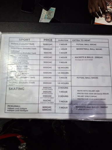 Went for skating, but only stayed 10 min because the floor is not level. It is similar to plastic tiles which create tripping hazards. The outside of the ring and basketball court would be the ideal surface but you're not allowed to skate there. We paid for 2 people for an hour with gear for 500ghc and they refused to give a refund, however would allow you to exchange for another game. We didn't want to do anything else so they allowed us to pay it forward for 2 people.
