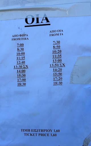 This is the bus stand of Oia. Buses operate between this bus stop and Fira. Im attaching the bus time table here as pasted on the wall. Buses are reliable. There may be delays of 5 min like but bus will come. This bus stop is located close to main walking alley of Oia where main photo stops like 3 blue domes are located. Main walking alliey starts about 500m before bus stop along the coast towars fira. Bus stop is located close to midway of the alley and alley continues further towards Oia castle which is one of the best sunset spots. Other best place for sunset is 3 bells of Fira or on its path. Central bus stand in Santorini is located in Fira, which is the capital of Santorini. Buses run to other areas of the island from Fira. So from one area, you have to first get to Fira and then to the other area. For example, To get to airport from Oia, first get to Fira bus stand and then to airport. You have to pay buses in CASH and should be bought from...
