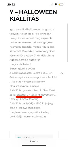 Read moreA Nádasdy-kastélyban a halloween kiállítást szerettük volna megnézni. Ma október 28.-a van, és ahogyan a mellékelt képernyőfotón is látszik, a weboldalon azt írták, hogy ma nyitva van. Amikor megérkeztünk, akkor szembesültünk vele, hogy a kastély valójában a mai napon zárva tart, ahogyan a kiállítás is. Összesen 3 órát utaztunk, autópálya matricát vásároltunk, rengeteg üzemanyagot elhasználtunk, mindezt fölöslegesen… És nem mi voltunk az egyetlenek… Gratulálok hozzá, hogy így tudnak játszani az emberek pénzével...