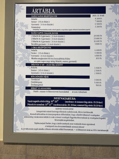 Read moreSajnos sok jót nem tudok ìrni. A fürdő nem túl szép látványt nyújtott. Mindenhol beton és vasszerkezet. Az öltöző beázott, több helyen vödrök voltak kihelyezve,amibe csepegett a víz. Az épület több helyen is beázott,illetve beázás nyomok láthatók a mennyezeten. Úgy gondolom,hogy ilyen drága jegyárak mellett lehetne igényesebb a fürdő környezete és kinézete. Pozitívumként emelném ki a masszázs szolgáltatást ami nagyon kellemes volt. Viszont árban nagyon drága,melyet a fürdő honlapján sehol nem találtunk meg. Összeségében nem nyerte el a teszésünket, sajnos számunkra...