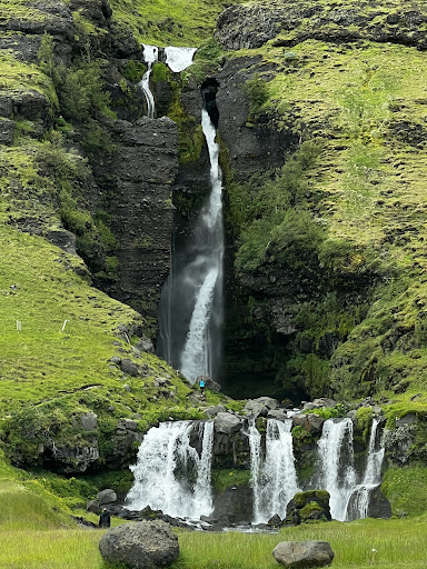 Beautiful waterfall right in our property. "Discover the enchanting tranquility of Gluggafoss, a hidden gem tucked away in Iceland's southern countryside. Not as tall as some others, at 44 meters, Gluggafoss, also known as 'Window Falls,' captivates visitors with its unique structure of openings and caverns carved out by the water over time.