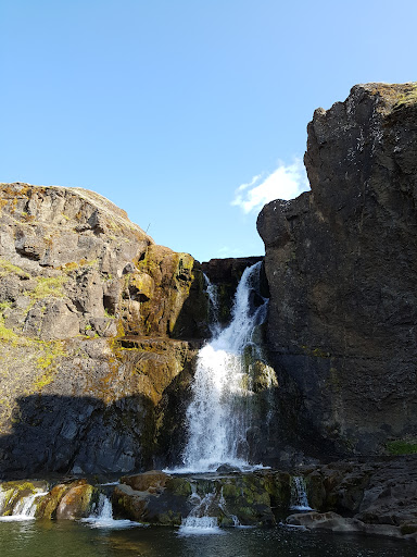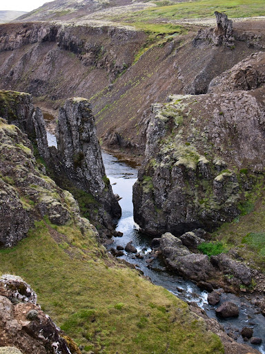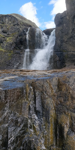 Read moreDas Tröll ist ein Wesen aus der germanischen Mythologie, ein Riese, „übergroß, gewalttätig, bedrohlich und Menschen wie Göttern gegenüber feindlich gesinnt.“ - Das isländische Tröll hat somit wenig gemeinsam mit den niedlichen Troll-Puppen die in Schweden oder Norwegen an Touristen verkauft werden. Tröllafoss ist nicht besonders gross oder kraftvoll, aber die Schlucht flussabwärts vom Wasserfall ist dagegen sehr beeindruckend und nicht ganz ungefährlich. Direkt unterhalb von Tröllafoss kommt man leicht hinunter zum Fluss um den Wasserfall zu betrachten, aber ansonsten könnte es ein riskantes Unternehmen sein zu versuchen an anderen Stellen hinunterzuklettern oder zu versuchen unten in der Schlucht am Fluss entlang zu gehen. Das ist jedenfalls nichts für Familien mit Kleinkindern. Tröllafoss Slóði ist an manchen Stellen nur mit Geländewagen befahrbar. Am besten man parkt etwa 300 m ab der Strasse und geht dann zu Fuss, etwa 2,5 km bis Tröllafoss. Die Fusswege entlang der Schlucht sind nicht markiert. Sie liegen streckenweise an sehr steilen Hängen wo es bei Nässe glitschig werden kann, aber man kann dann immer einen alternativen Weg wählen. Bemerkung: In einer Rezension hier auf Google wird Tröllafoss als ein besonders kinderfreundlicher Ort gepriesen. Das ist totaler Blödsinn und es ist sicher damit ein ganz anderer Ort...