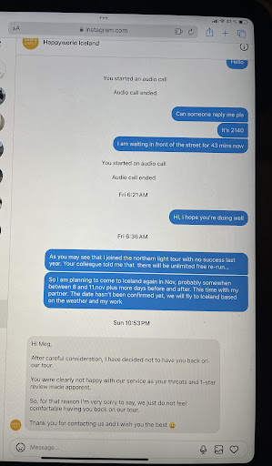 However, when I reached out to claim the free re-run, I was ignored. After seeing them post on Instagram, I decided to comment, asking for a response. Their reply came two days later, and instead of offering help or solutions. I was met with a dismissive and rude message stating that they didn’t want me back on their tour because of my negative review a year ago.