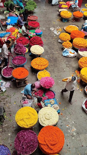 As you walk further 🚶♂️, the market reveals its many layers. Apart from flowers, there are stalls selling spices 🌶️, fruits 🍎, vegetables 🥦, incense sticks 🕯️, and pooja items 🪔. The aroma of spices blends beautifully with the smell of fresh flowers, creating an unforgettable sensory experience.