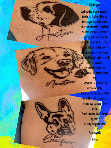 I went in to be reunited with my lost kids, by getting them inked on me. It has been been a ritual for me on my birthdays. Raghav and his team at the Tattoo shop were kind enough to accommodate me on a Sunday tight schedule. He did take extra care to customise the tattoo to suit my needs which encompassed the years of my pet from a puppy to a senior all in one tattoo. With his stupendous work and art, am reunited with my kids. My sincerest thanks to him and team. The place has a decent wait couch and nearby eateries. Above all am extremely impressed with the team who are just about professional and not trying to be overtly friendly or robotic. Just the apt amount human professional. Kudos