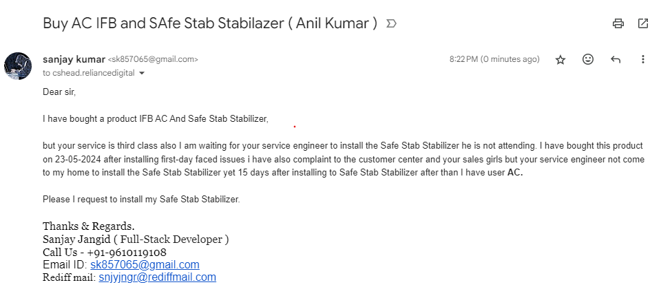 This pertains to the pending after-sales service and the associated delays and reluctance from the store and back-office team regarding the unitās installation. The focus seems overly skewed toward product sales, with insufficient attention given to post-purchase support.