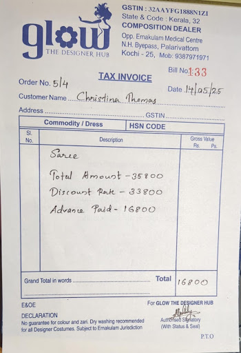 I had a really bad experience with Glow Deziner Hub, Ernakulam. It was honestly the worst experience ever. I had given them an order to design my reception outfit exactly according to a reference picture, and this was back in February 2025.