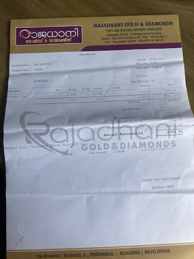 Read moredon't purchase from raadhani, I went to edapally rajadhani 1year ago for gold purchase and they said they're giving 95% resale value and 100% exchange value on diamond jewellery and I purchased 2 diamond studs for Rs.7150 from them as I had an emergency financial crisis I went to resale with the bill and card(certificate of authenticity) and they said they can only give 4000 rupee. they're giving wrong informations to make us buy diamond from them, if I've purchased gold stud instead it'd have cost less than 3.5k totally. I recommend these people to beg on streets it'd be more better than cheating customers. I'll never ever purchase anything...